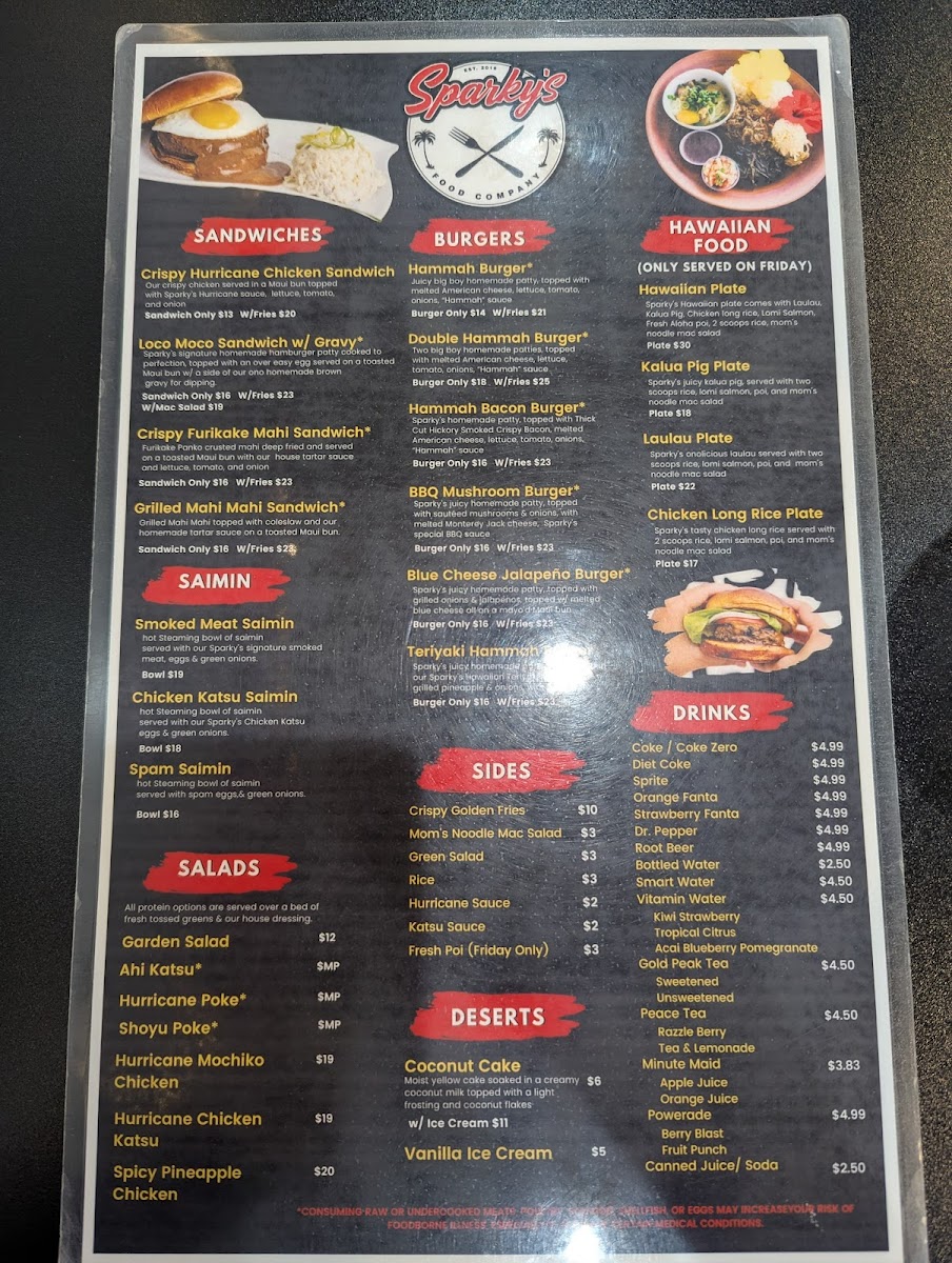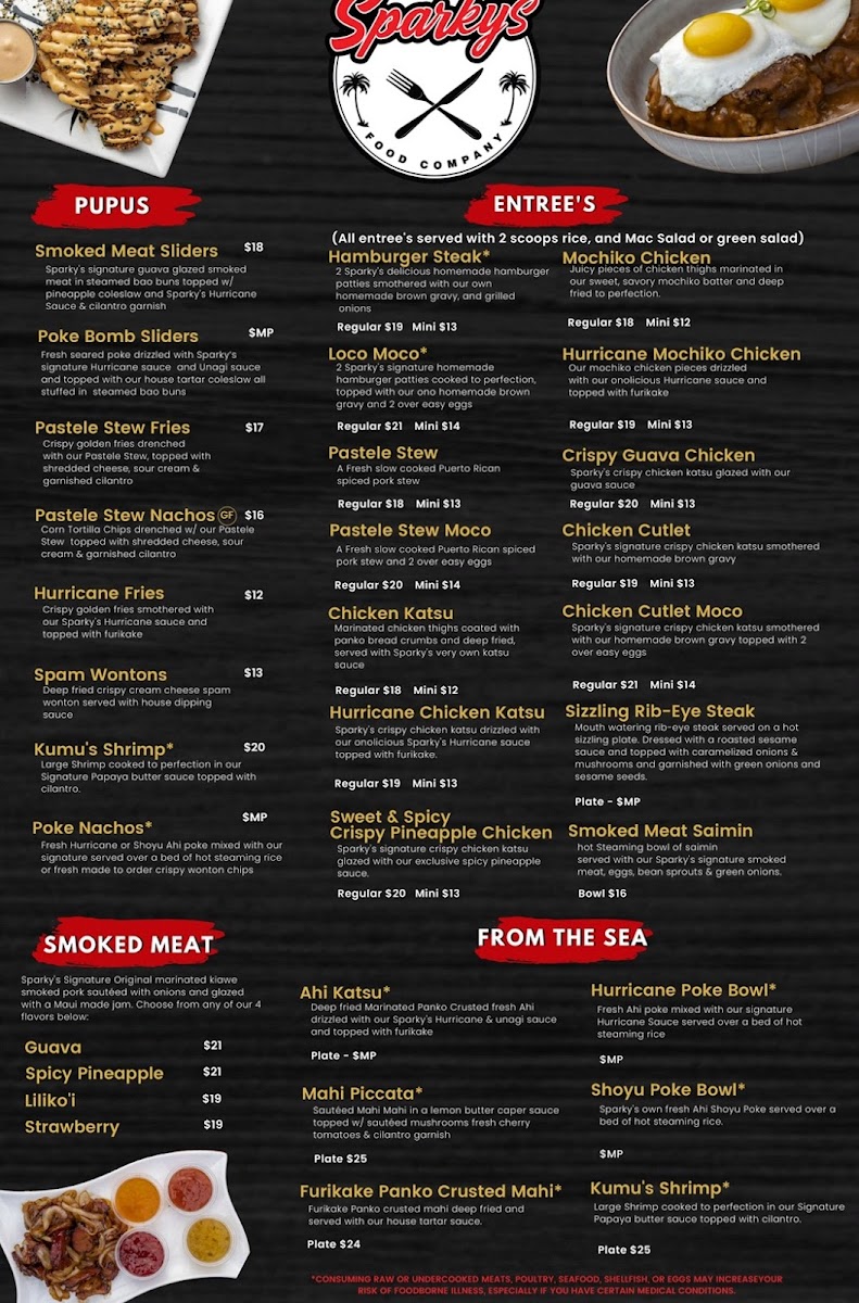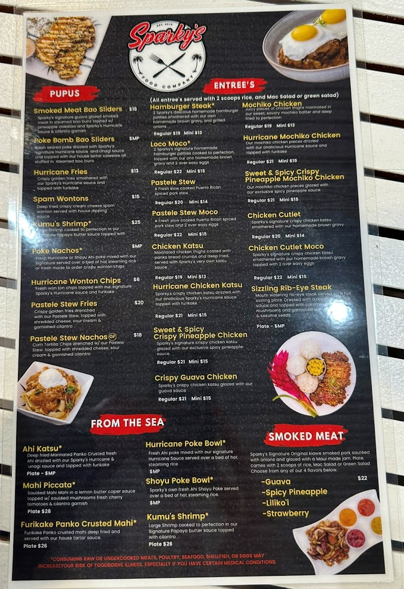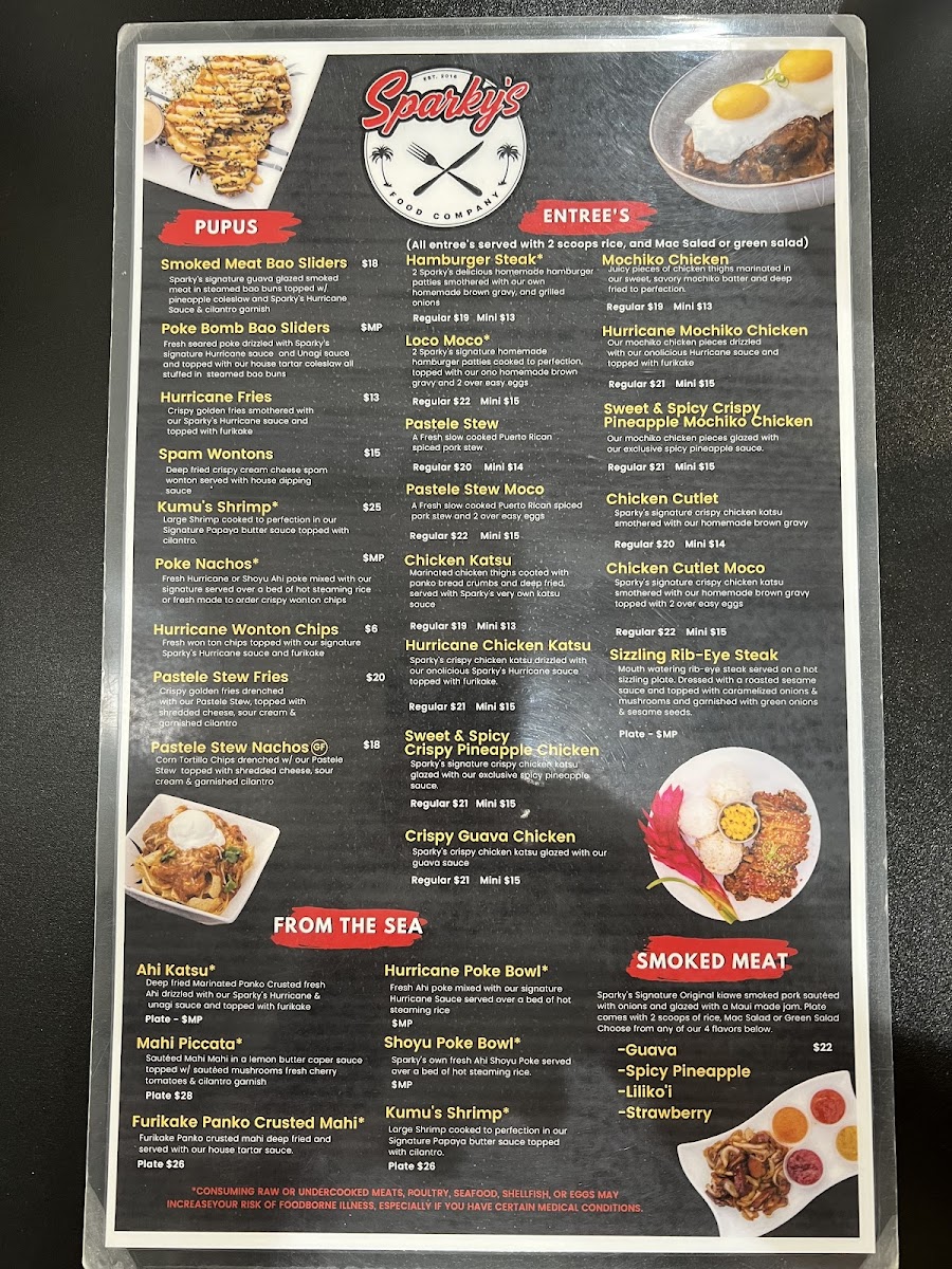 Welcome to Sparky's Food Company - Restaurant, a gem nestled in Kahului, Hawaii, where local flavors shine through an enticing menu. This establishment beautifully showcases Hawaiian culinary traditions with offerings like the succulent Kalua Pig Plate and the hearty Hawaiian Plate, perfect for those craving authentic island cuisine. The Chicken Long Rice Plate offers a comforting taste, while the refreshing Hurricane Poke and Ahi Katsu salads bring a delightful burst of flavors.