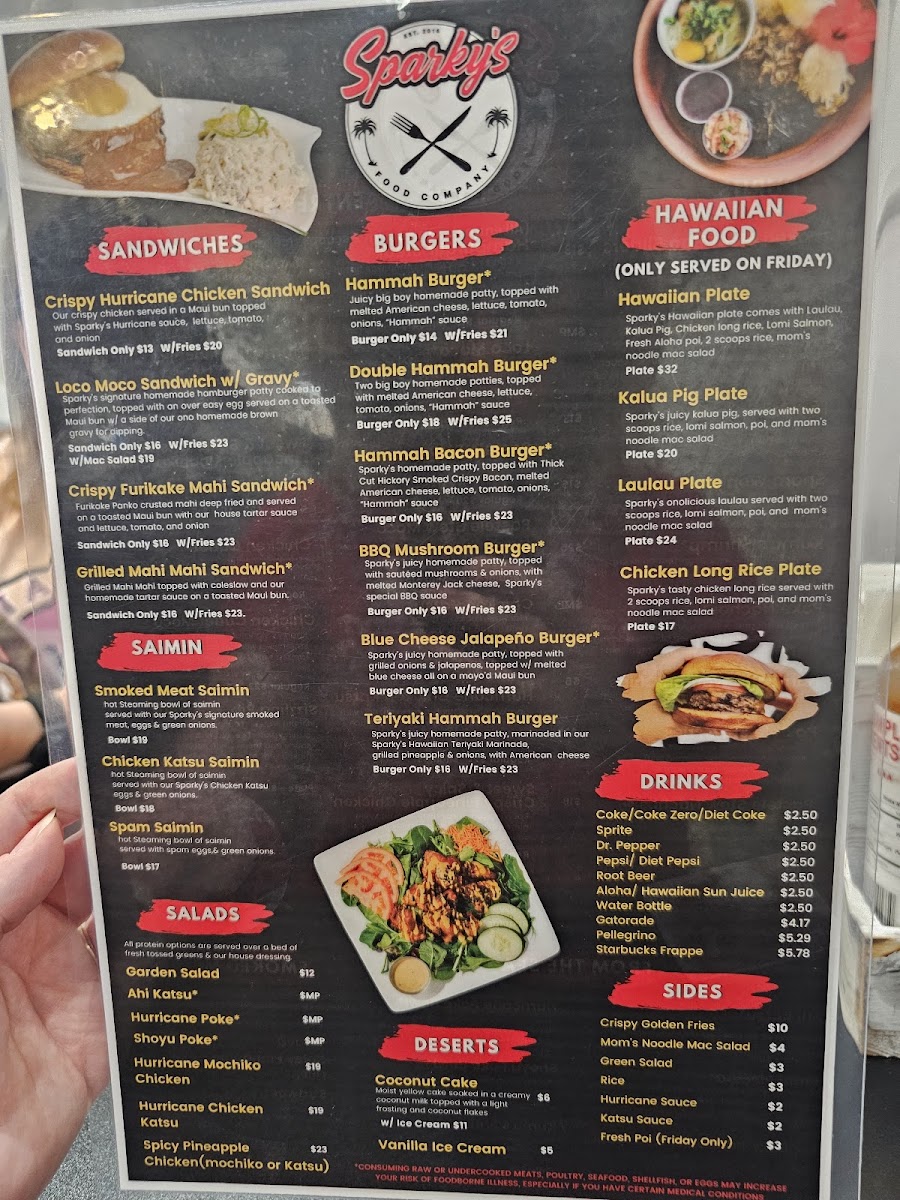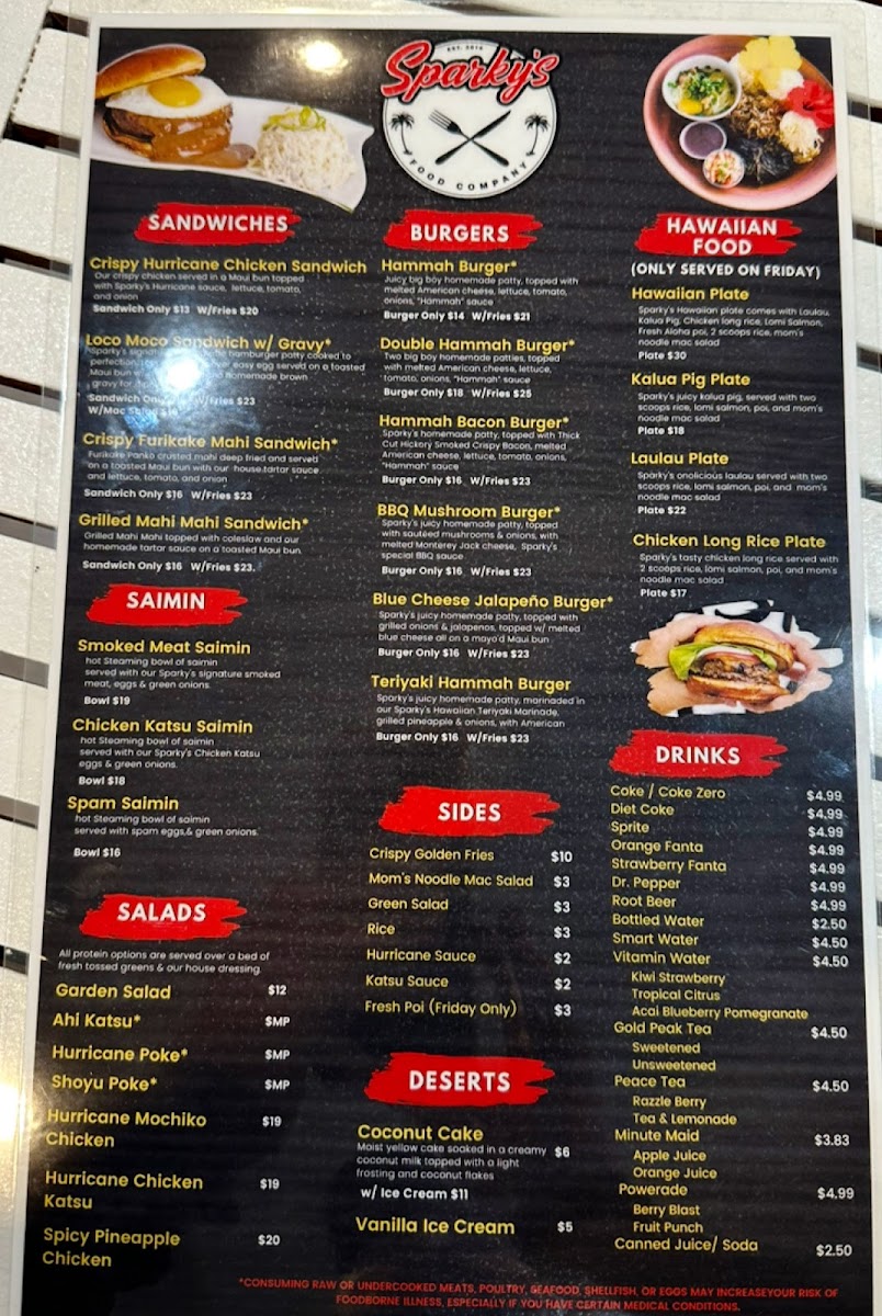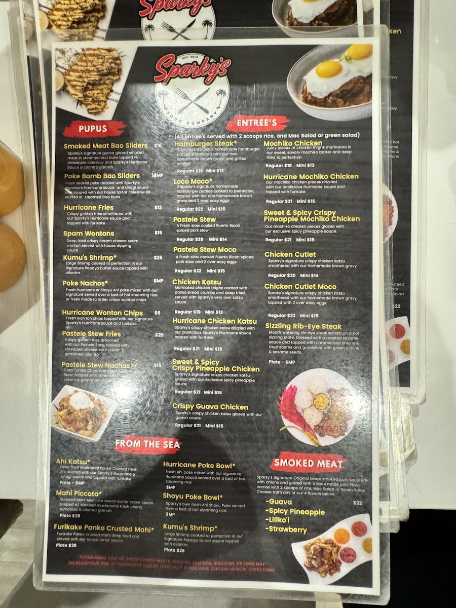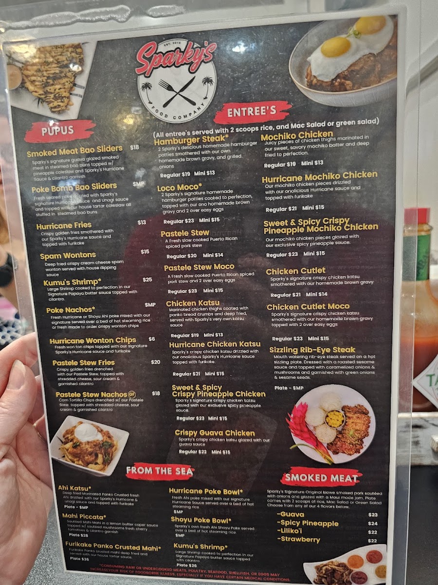 Welcome to Sparky's Food Company - Restaurant, a gem nestled in Kahului, Hawaii, where local flavors shine through an enticing menu. This establishment beautifully showcases Hawaiian culinary traditions with offerings like the succulent Kalua Pig Plate and the hearty Hawaiian Plate, perfect for those craving authentic island cuisine. The Chicken Long Rice Plate offers a comforting taste, while the refreshing Hurricane Poke and Ahi Katsu salads bring a delightful burst of flavors.